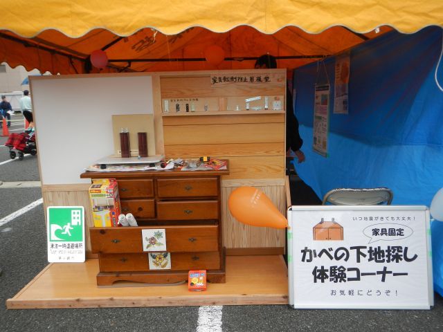 起震車の手前にはかがつまで提供した家具の倒壊防止啓蒙模型が展示され興味を持たれていた。