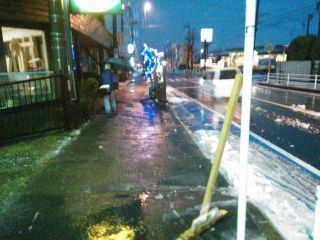 夕刻になり雪も峠を越したようなので弊社前歩道、向こう三軒両隣り50mほどを、急こしらえの特性雪かきグッツを駆使して道行く人の為歩道の雪かきを済ませた。